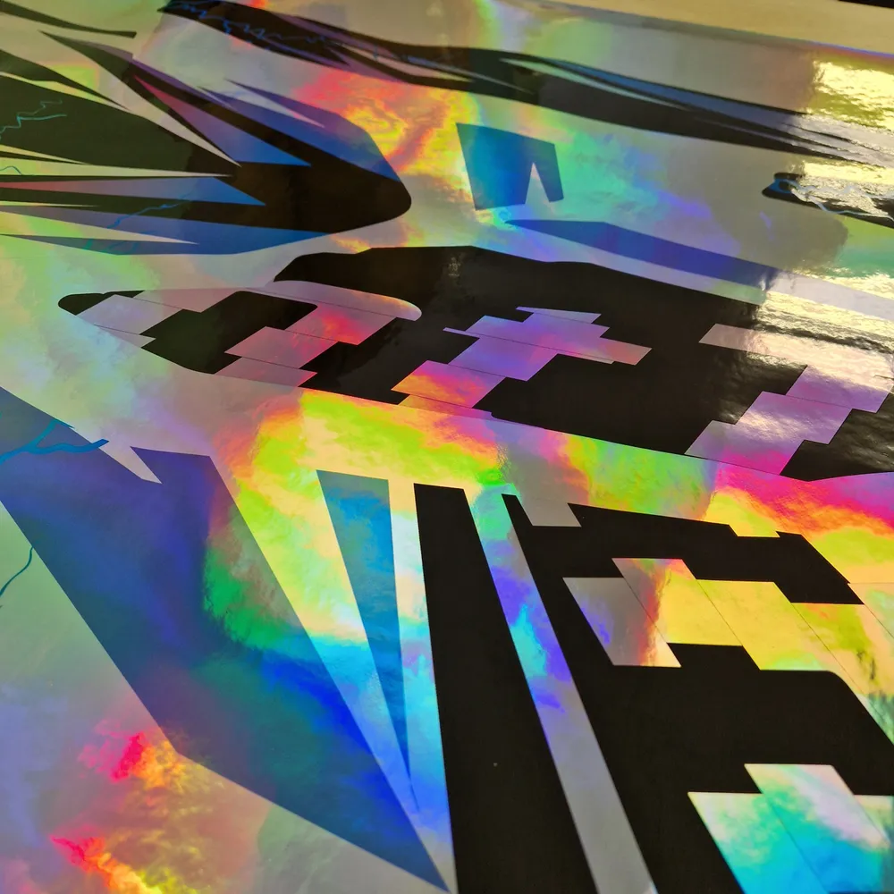 Яркие, флюр цвета (кислота, неон) недостижимы в печати из за ограниченного цветового охвата применяемых чернил. Поэтому мы печатаем на кислотной плёнке и изменяем макет так чтобы в нём оставался минимум цветов — оттенки чёрного и кислота.